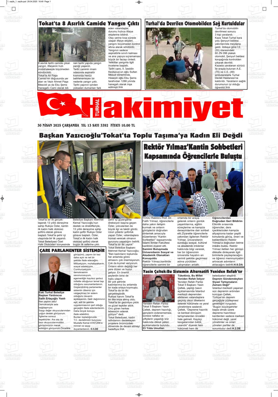 Tokat Yerel Gazeteleri 15 Nisan 2026, Çarşamba Günü Manşeti